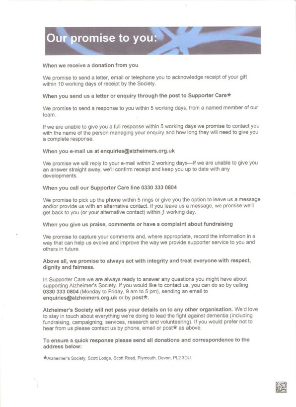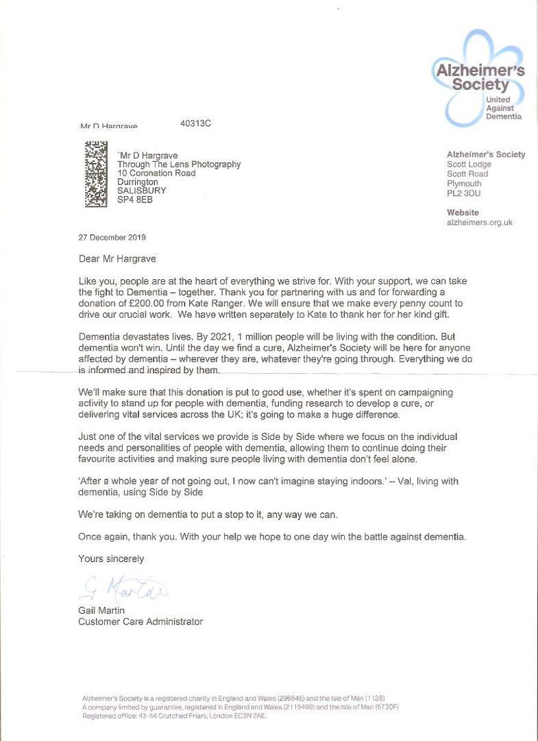 Extract from a recent thank you e-mail received from the Alzheimer's Society