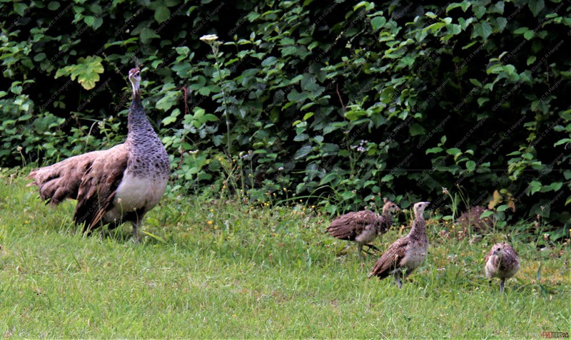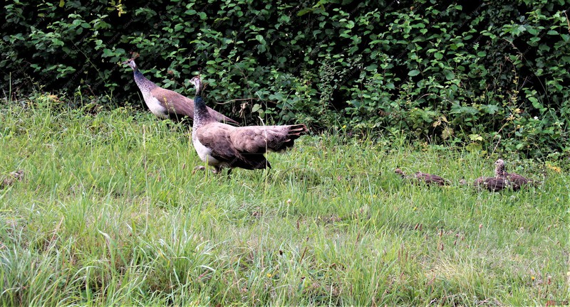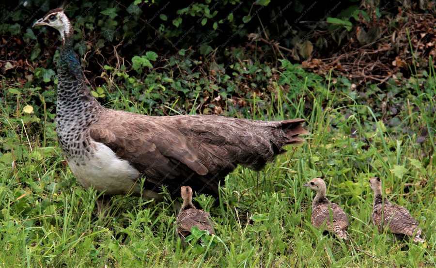 Peahens walk around with their chicks and vocalize and teach them which foods are appropriate choices.