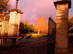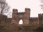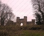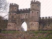 pointed arch flanked by two 3-storey circular turrets, which extend sideways to a 2-storey square tower at each end of the wall.