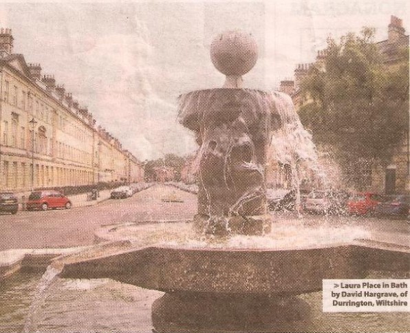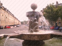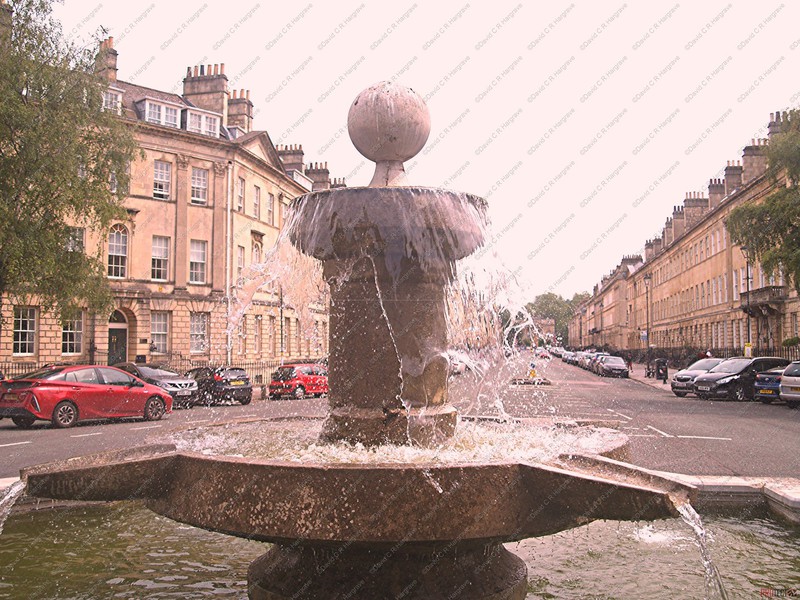 Fountain. 1877, reconstructed 1977, only basin remains of original design. By AS Goodridge. MATERIALS: Limestone. PLAN: Square plan with segmental bays to each facet almost forming circle. EXTERIOR: Outer bowl has rounded coping and moulded plinth with small colonnettes carved into angles. Centre is pedestal with shallow straight-sided bowl with chutes protruding toward angles below cylindrical shaft to similar smaller bowl and C20 lead ball finial that replaces former gadrooned urn. HISTORY: Fountain was erected in 1877 to mark Centenary of Bath and Western Counties Agricultural Society, but this was to very different design from today. Fountain was reconstructed in 1977 to mark Bicentenary (see photographs for its original appearance and the opening in 1877). Centre of Laura Place had been proposed for a column to commemorate Nelson in 1805; and for a "Reform pillar" to be designed by HE Goodridge in 1832: the Pulteneys had always been a family with Whig sympathies. SOURCES: (The Bath Chronicle: Images of Bath: Derby: 1994 -)