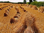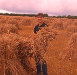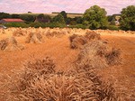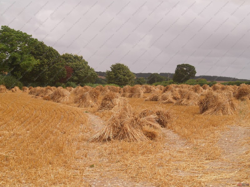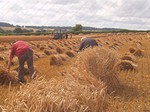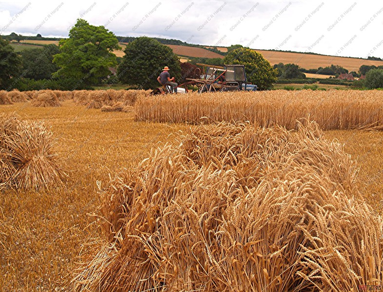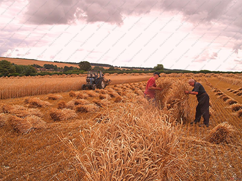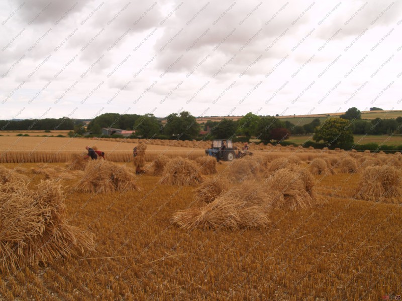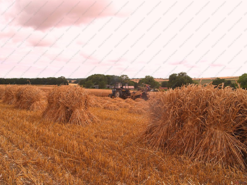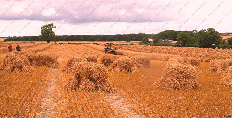 preserving it’s strength. The grain moisture content at this point is about 30%. The sheaves are then stood up, ‘stooked’, in the field to slowly dry and condition the straw in its prime condition,