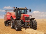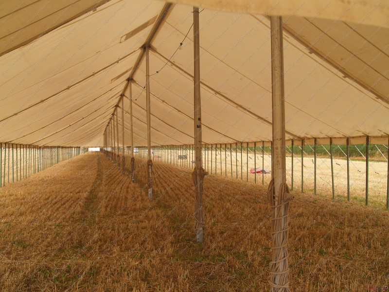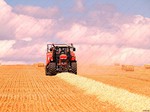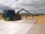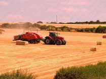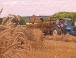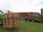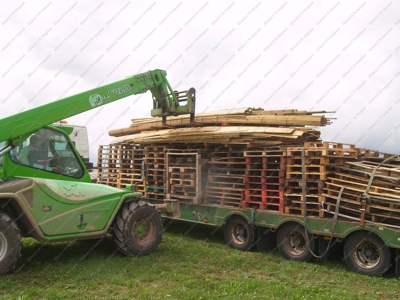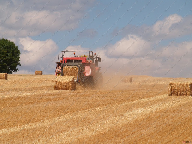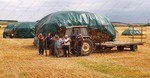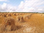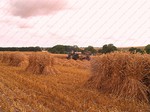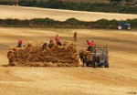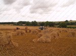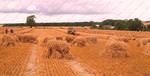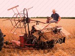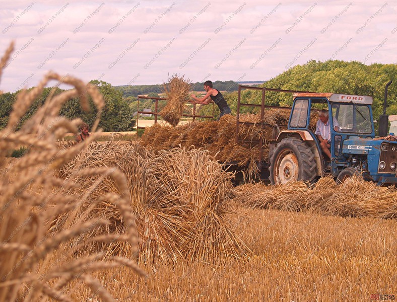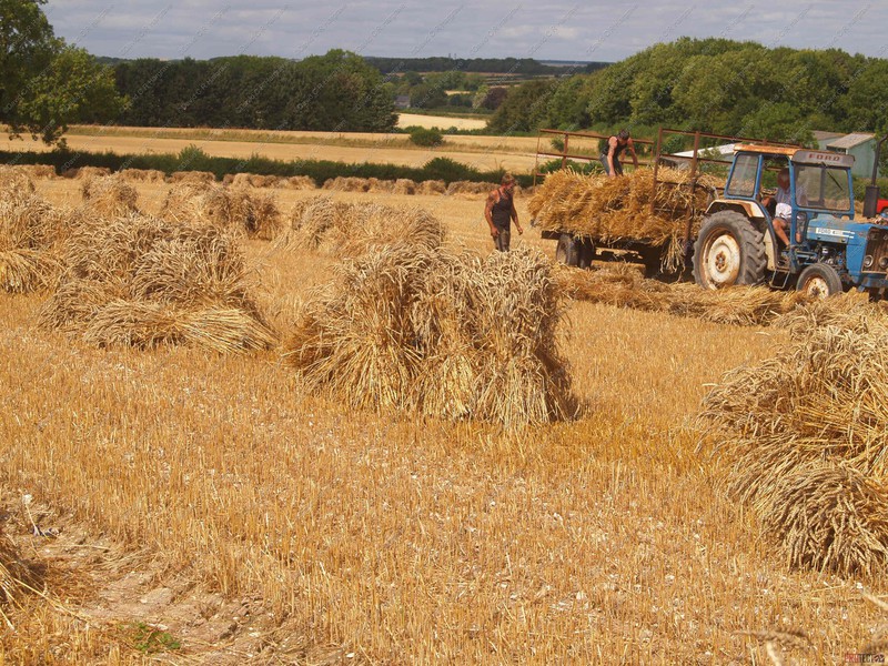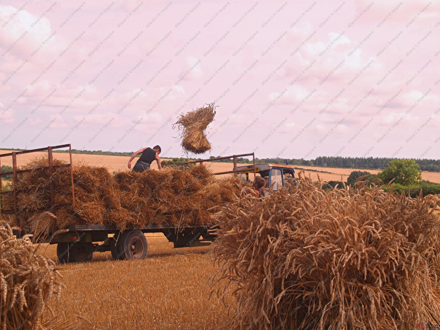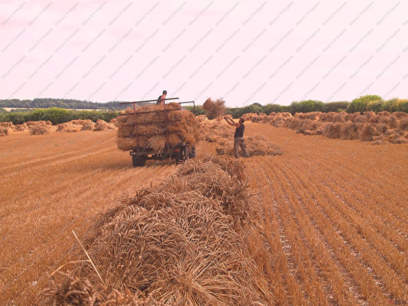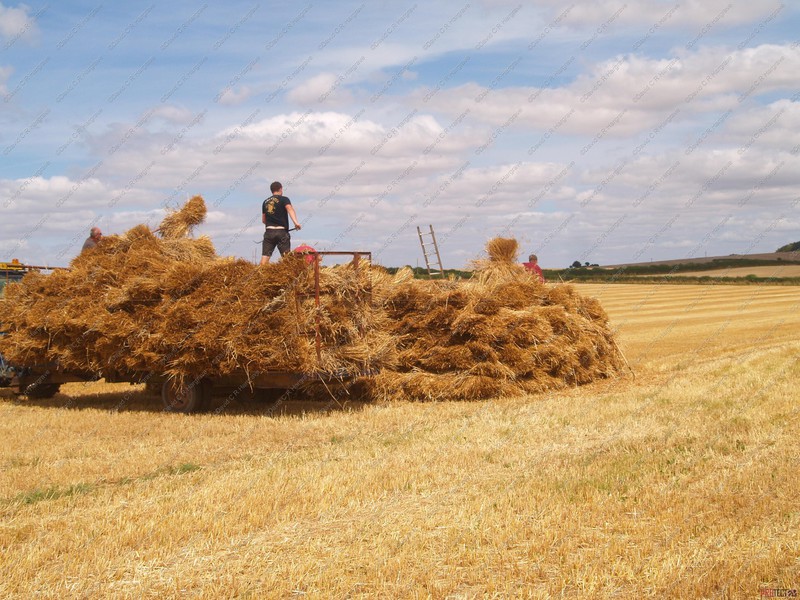 On site a reaper binder is used to cut the straw which is cut in mid-July then stoked for two weeks to dry, then hauled and stacked. The sheaves are left in the