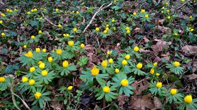 The winter aconite is shorter than its chum the snowdrop, but has wider, more interesting leaves that are shaped a bit like baseball mitts