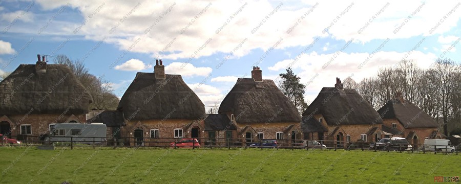 Gardener's cottage, kitchen garden with a full set of boiler houses and potting sheds, thatched apple store and a range of six thatched 'pepper pot' cottages originally inhabited by estate