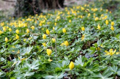 The winter aconite is shorter than its chum the snowdrop, but has wider, more interesting leaves that are shaped a bit like baseball mitts.