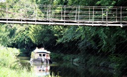 The footbridge is privately-owned and crosses the Kennet and Avon Canal at Stowell near Wilcott. I managed to photograph the barge on a canal trip as it passes