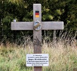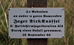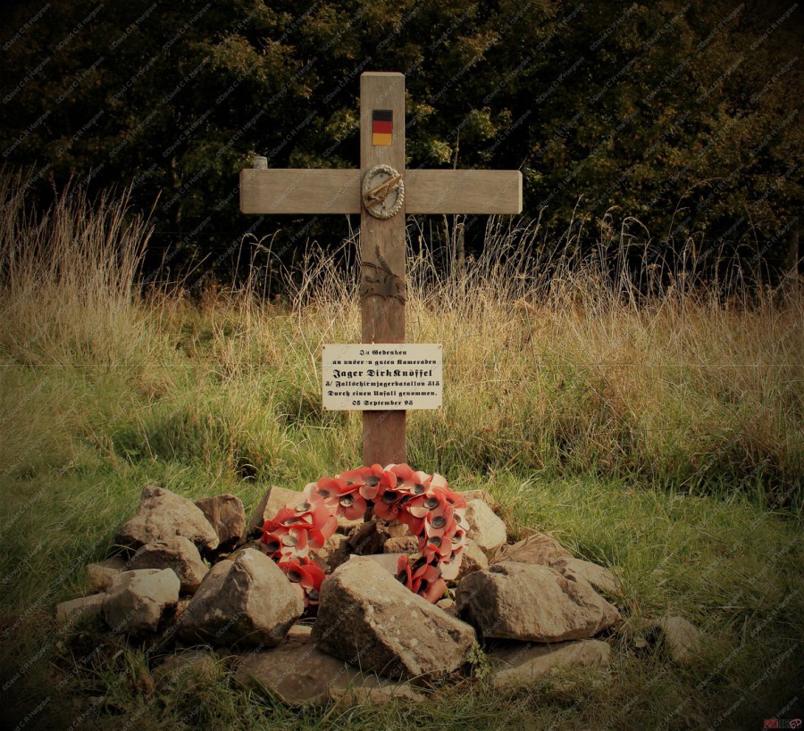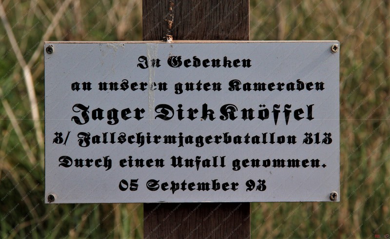 The cross was put up to mark the place where Jager Dirk Knoffel of 3 Company 313 Fallshirmjager Battalion - a Parachute unit of the German Luflande Brigade who was killed in an anti-tank vehicle that rolled over in 1993.
